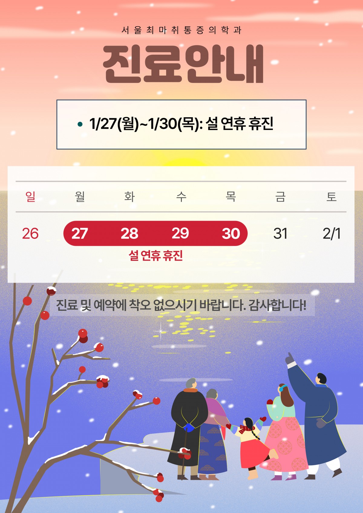 1월 진료안내 페이지 정보 작성자 최고관리자 댓글 0건 조회 66회 작성일 25-10-01 14:46 진료 및 예약에 착오 없으시기 바랍니다. 감사합니다! 목록 프린트 이전글5월 휴진안내 댓글목록 댓글목록 등록된 댓글이 없습니다.